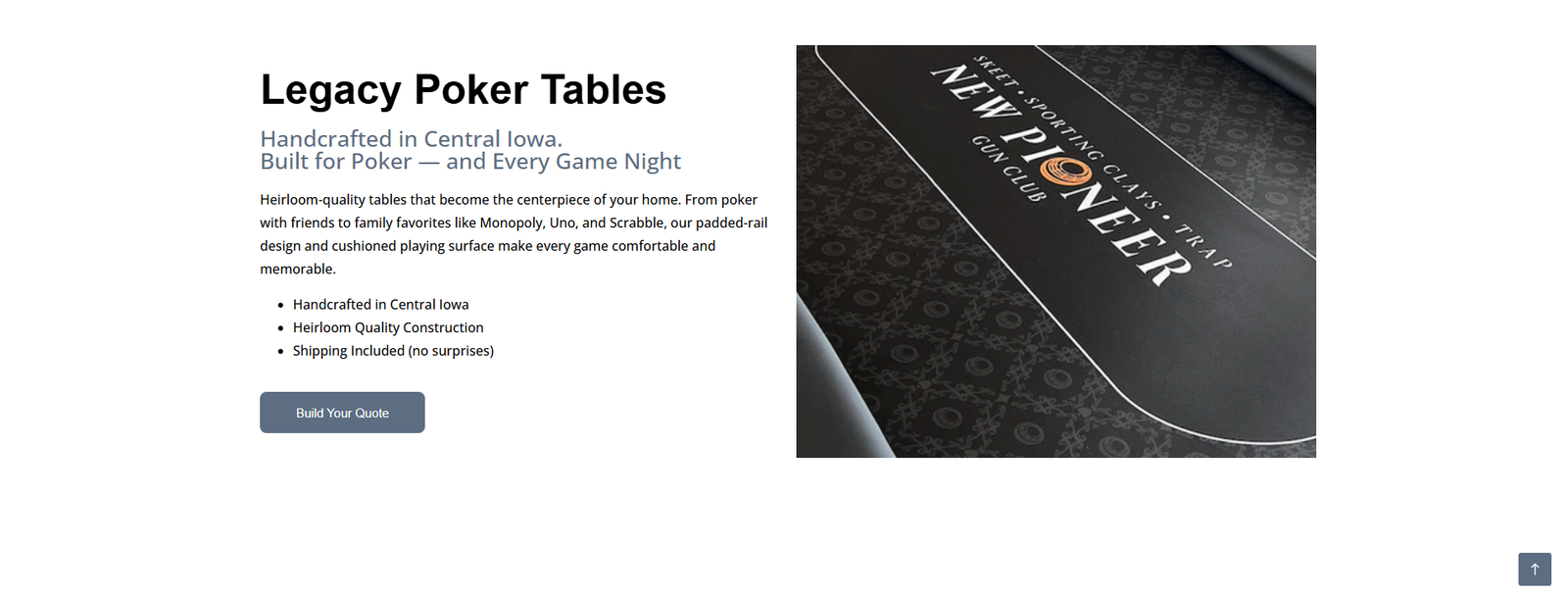 A product-focused website built for a custom poker table manufacturer, designed to showcase handcrafted gaming tables, highlight customization options, and provide a streamlined quote request process for customers.
