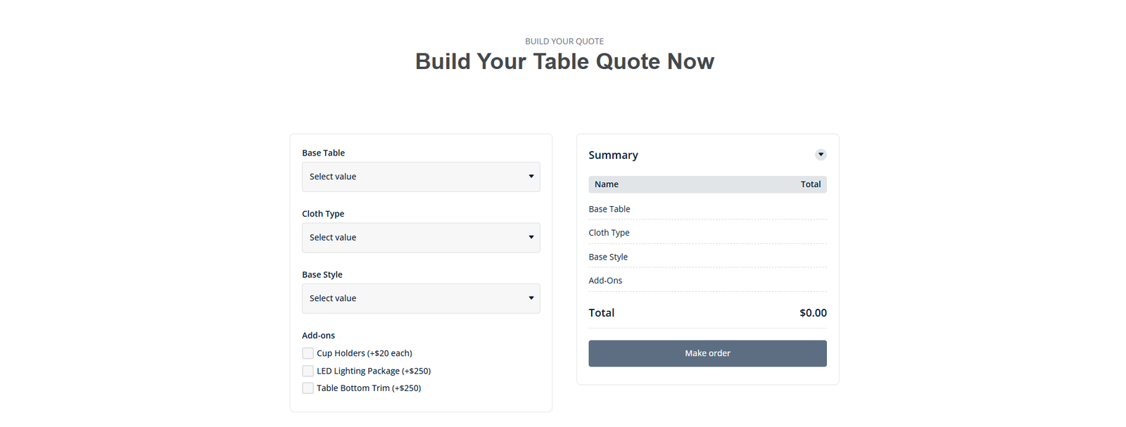 The platform presents detailed product information, customization features, and a streamlined quote-building process that allows customers to configure their ideal table. The website focuses on clean design, strong product presentation, and smooth navigation to create a professional experience across desktop and mobile devices.